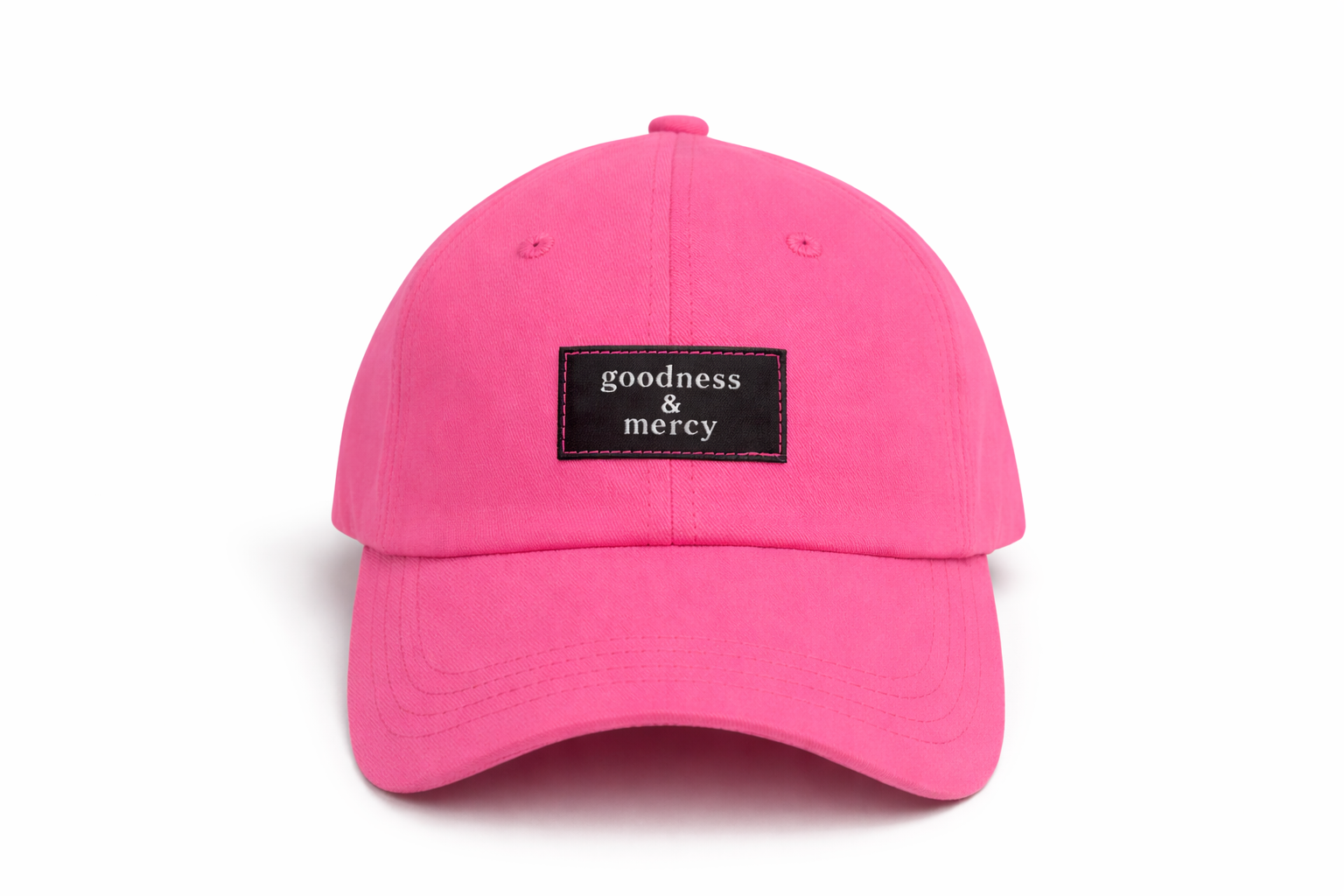 Unapologetically bold. In a radiant bright pink finish, The Radiant Mercy Cap pairs vibrant expression with refined detail. Lined in smooth satin for comfort and care, it features a minimalist black patch inscribed with Goodness and Mercy: a declaration of divine covering in every season.