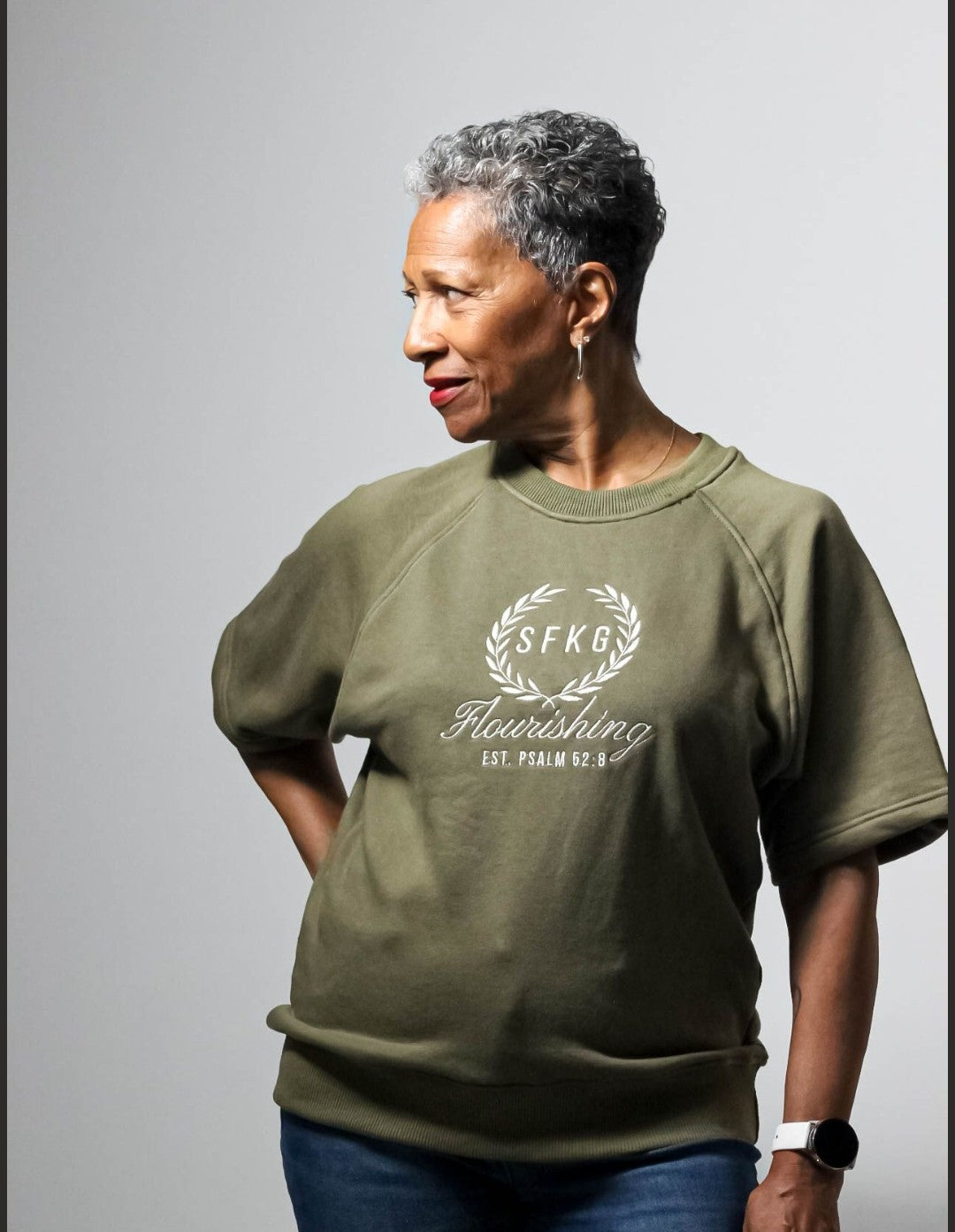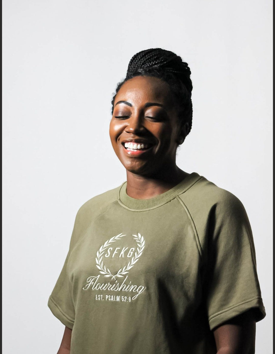Elevate everyday essentials with the Eden Flow Shirt in Olive with white embroidery. Soft French terry, short sleeves and embroidered SFKG framed by olive branches with Flourishing beneath inspire by Psalm 52:8, create a subtle expression of faith and timeless style.